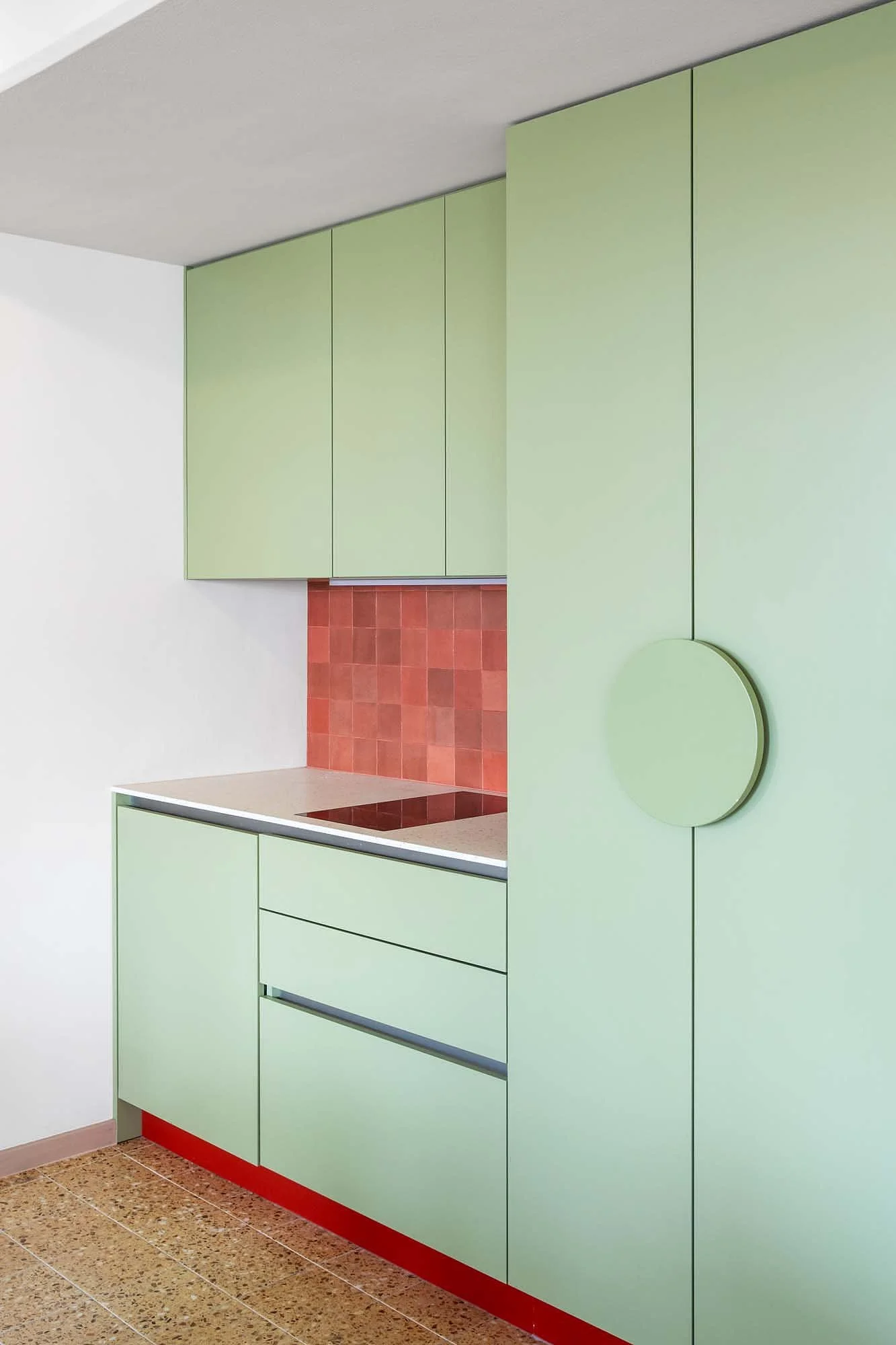 Die Farbpalette: warmes Terrakotta, tiefe Rost-, leichte Rosé- und sanfte Grüntöne, inspiriert von der Aussicht auf die Servitenkirche. Räume, die Transformation fördern und zum Durchatmen einladen.